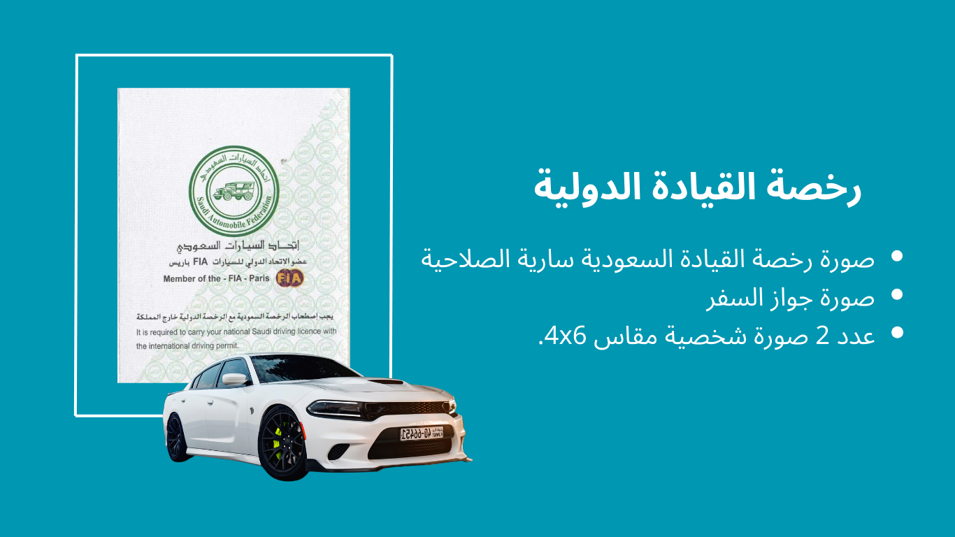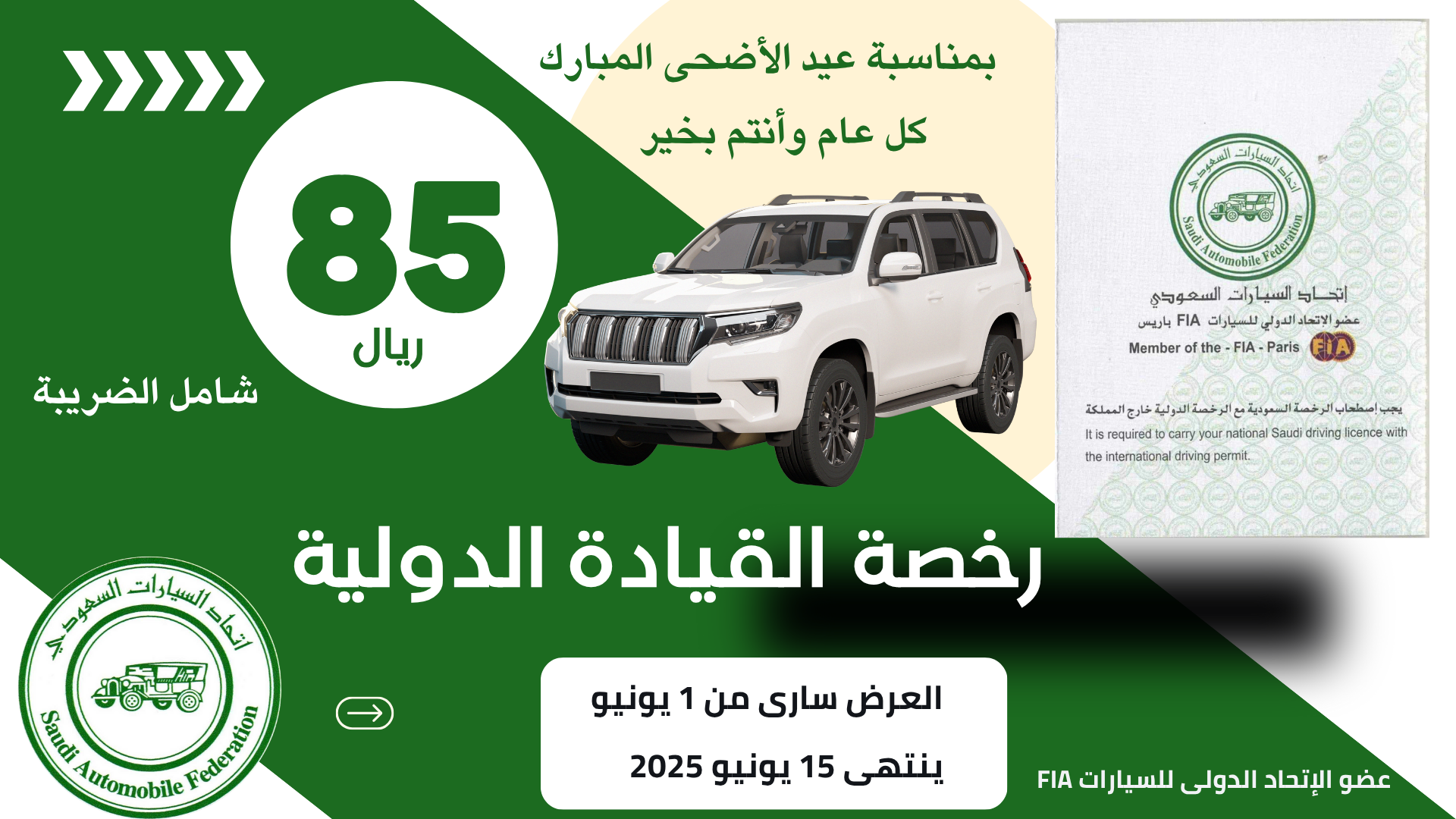 - "احصل على رخصة القيادة الدولية من اتحاد السيارات السعودي واستمتع بالقيادة في أكثر من 150 دولة حول العالم!"
